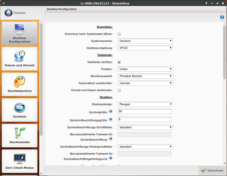 In der Desktop-Konfiguration wird die grafische Benutzeroberfläche des jeweiligen Gerätes festgelegt, Bildschirmschoner-Einstellungen vorgenommen, sowie Datum und Uhrzeit eingestellt.