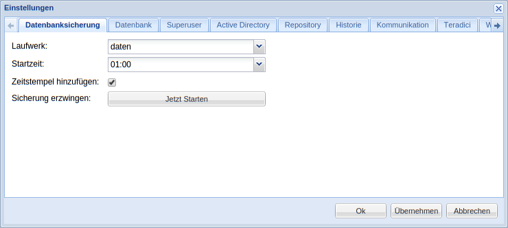 Hier können Sie ein lokal angeschlossenes Laufwerk oder Netzlaufwerk angeben, auf dem die Datenbanksicherungen des TCMS gespeichert werden. Das (Netz-)Laufwerk muss vorher über die Kommbox eingerichtet worden sein, damit es in dem Drop-Down-Menü zur Verfügung steht.
