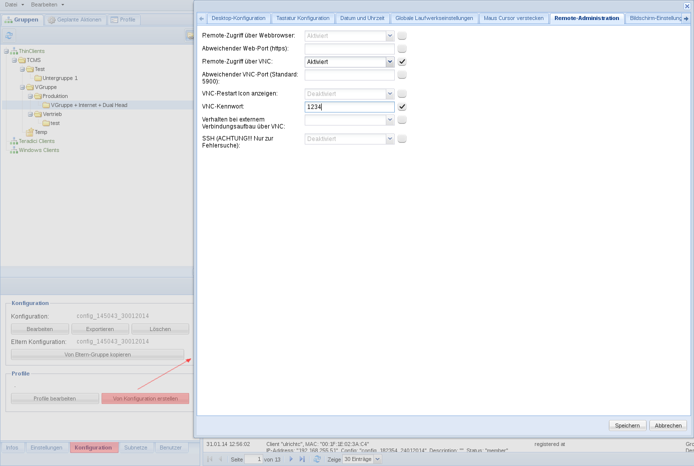 Ein Profil wird im Gruppeninformationen-Fenster unter Konfiguration durch den Button Von Konfiguration erstellen angelegt. In einer Maske können Optionen aktiviert und deren Werte anschließend editiert werden. Stellen Sie vorher sicher, dass der ausgewählte Wert angewendet werden kann und nicht zu technischen Beeinträchtigungen der Thin Client Software führt.