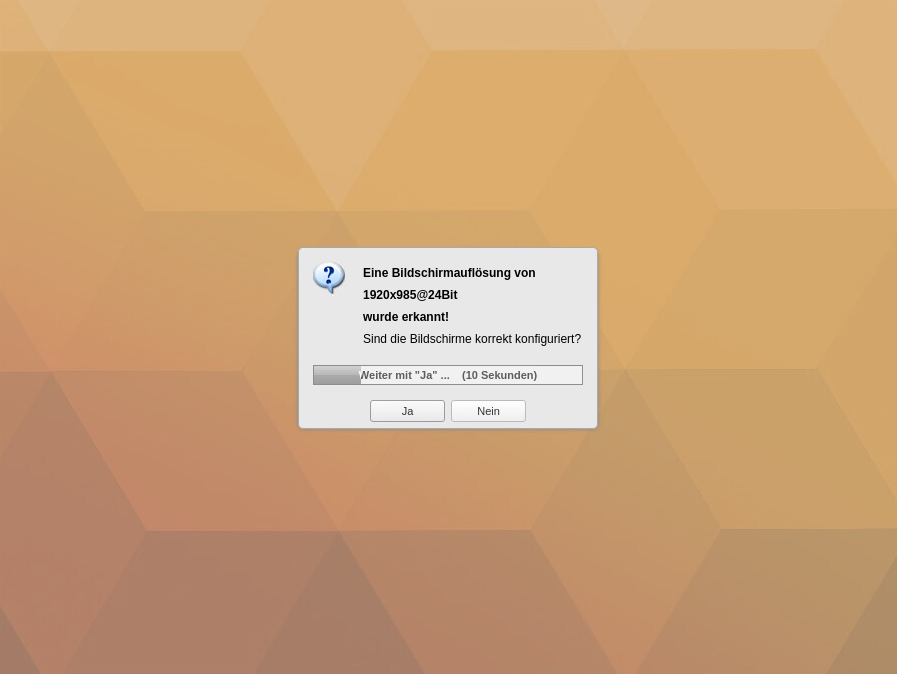 Sie können die ermittelte Bildschirmauflösung vorzeitig bestätigen, indem Sie auf Ja klicken - erfolgt 10 Sekunden lang keine Eingabe von Ihnen, so wird die ermittelte Bildschirmauflösung gewählt.