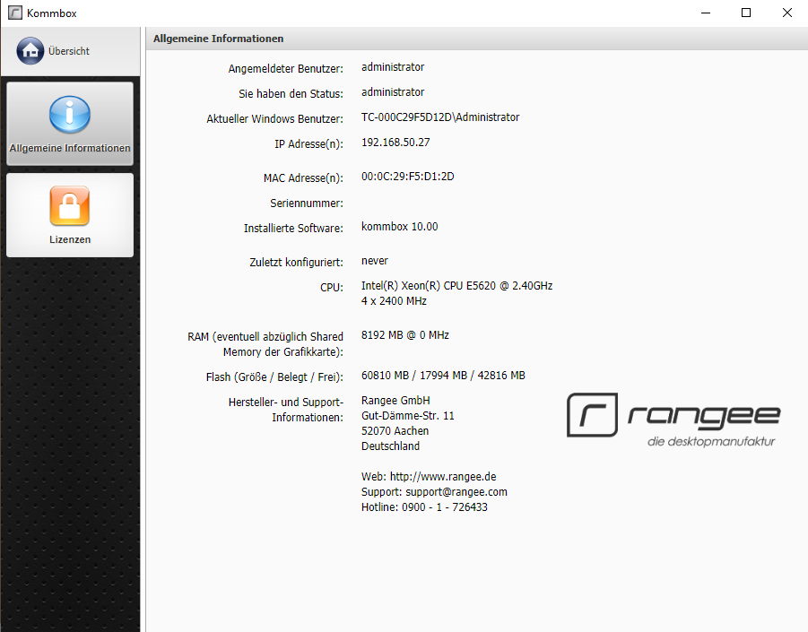 Die Allgemeinen Informationen bieten eine Übersicht über die wichtigsten Konfigurations-Einstellungen am PC. Dabei wird Ihnen angezeigt welcher Benutzer aktuell mit welchem Status am Gerät angemeldet ist. Voreingerichtet bietet Rangee Kommbox für Windows den Benutzer Administrator an, der alle Berechtigungen besitzt und den Benutzer Guest, welcher über eingeschränkte Berechtigungen verfügt.