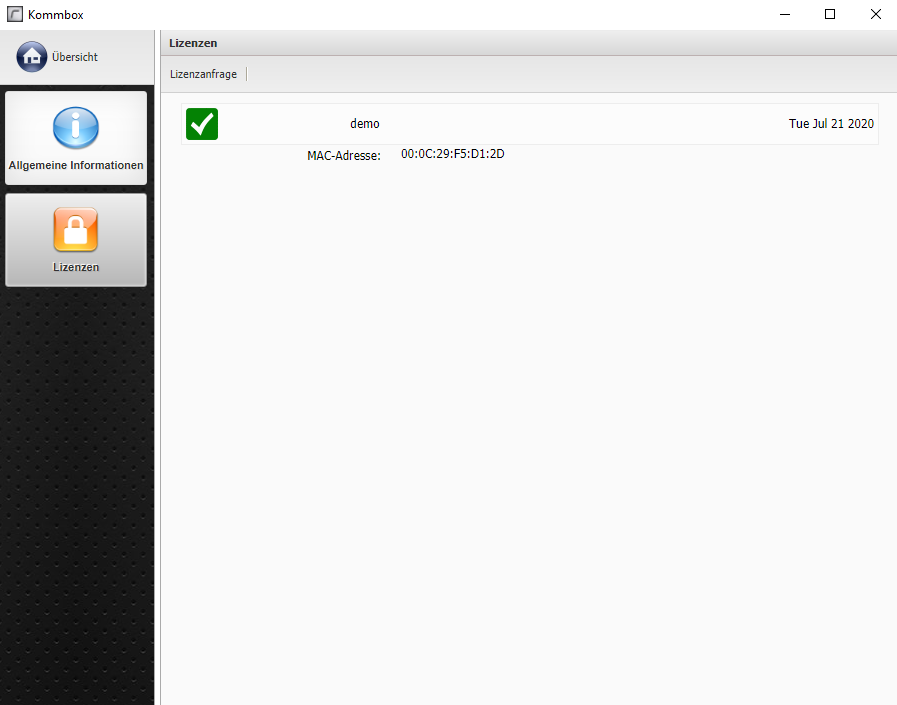 Auf der Lizenzübersichstseite können Sie sich alle zu dem aktuellen Gerät gehörigen Lizenzen anzeigen lassen und Sie sehen wann eine Lizenz abläuft oder ob Sie gültig ist. Ausserdem können Sie hier die MAC Adresse einsehen, welche zur Validierung der Lizenz genutzt wird.
