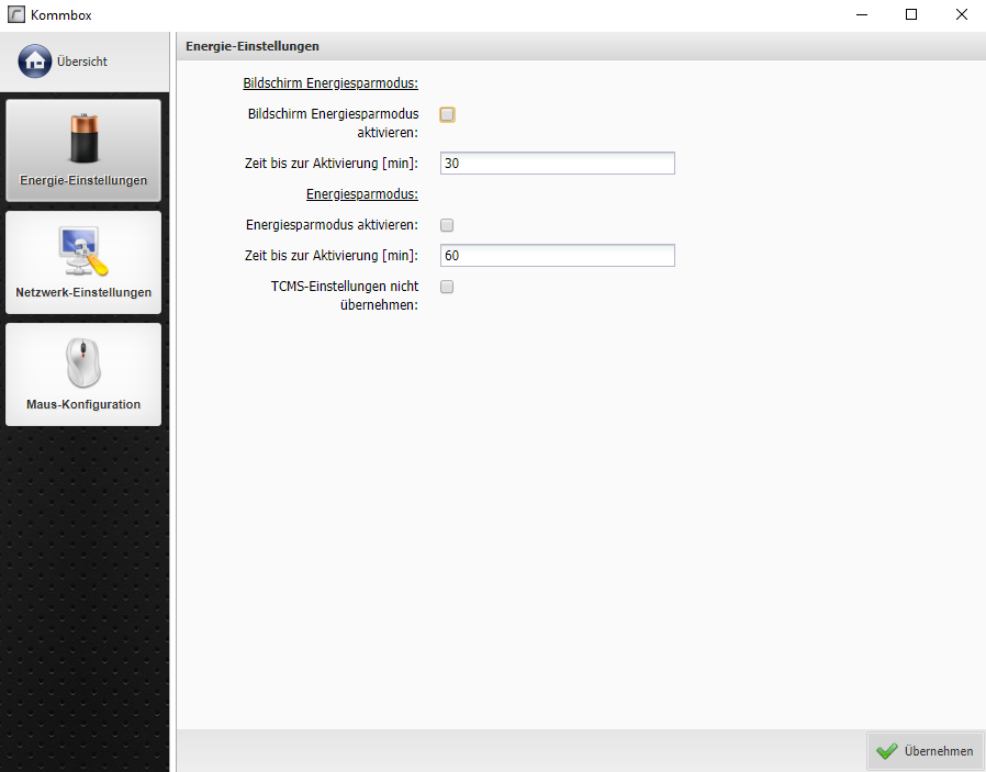 Hier können Sie die Energie-Einstellungen Ihres PCs vornehmen. Es gibt die Möglichkeit, sowohl den Energiesparmodes des Bildschirms, als auch des PCs zu konfigurieren.