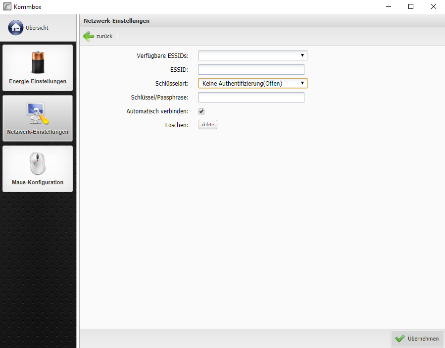 Unter ESSID kann der Name des drahtlosen Netzwerks angegeben werden. Mit WEP, WPA und WPA2 bietet Rangee Kommbox für Windows drei Verschlüsselungsmethoden für Funknetzwerke. Diese bieten Sicherheit bei der Übertragung sensibler Daten und regeln den Zugang zu Ihrem Netzwerk.
