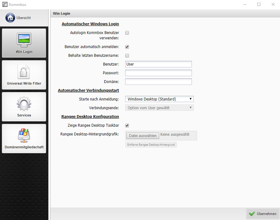 Hier können Sie festlegen, ob beim Starten des Systems der Windows Desktop oder der Rangee Desktop gestartet werden soll.
