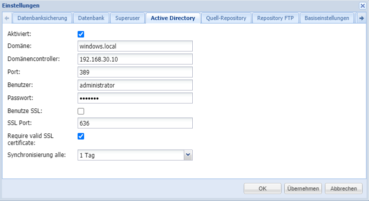 Verfügt Ihr Netzwerk über einen Active Directory Domänencontroller, so steht Ihnen die Möglichkeit zur Verfügung, dass sich ausschließlich authorisierte Benutzer () an Ihrem TCMS anmelden dürfen, welche dann administratorrechte erhalten. Tragen Sie dazu Ihre Daten in , , und ein und Sie die Option .