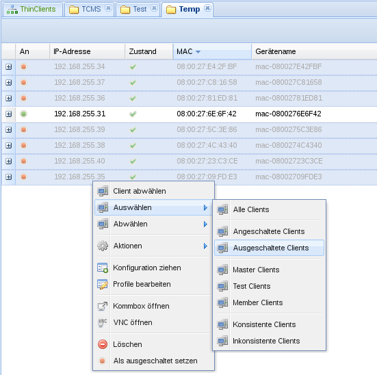 Zusätzlich besteht die Option in Kombination mit der Shift- bzw. Strg-Taste + Mausklick Auswahlen zu erstellen bzw. zu differenzieren. Über Rechtsklick auf einem ausgewählten Client, lassen sich dann auf die gesamte Auswahl Aktionen durchführen.