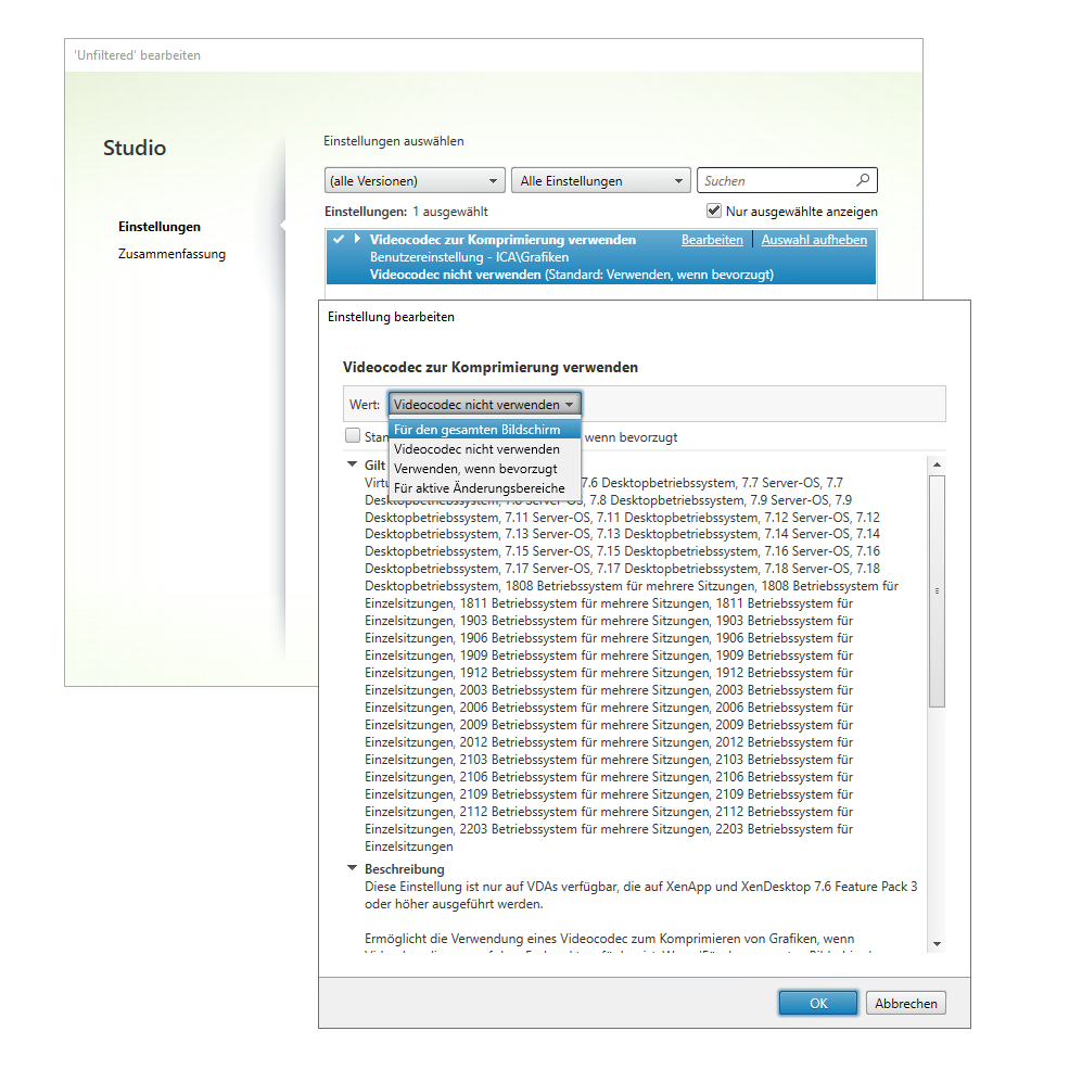 Hierzu kann im Citrix Studio eine Richtlinie erstellt werden mit der die Option "Videcodec zur Komprimierung verwenden" konfiguriert wird.
