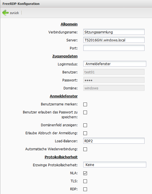 Wenn Sie zusätzlich die Verbindung über einen Gatewayserver tunneln möchten (für interne Verbindungen nicht empfohlen) tragen Sie Ihren "RD-Gateway" Server unter "Terminal-Server-Gateway (server:port)" ein. Im Standard wird das "RD-Gateway" über Port 443 angesprochen.