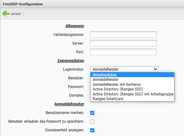 Die Anmeldedaten für die AD Anmeldung können in Verbindungen durchgereicht werden. Bei FreeRDP sieht es zum Beispiel so aus: (VMWareView, ICA und Andere sind analog konfigurierbar)