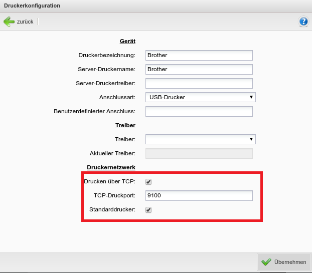 Aktivieren Sie unbedingt die Optionen  DRUCKEN ÜBER TCP  und  STANDARDDRUCKER  .