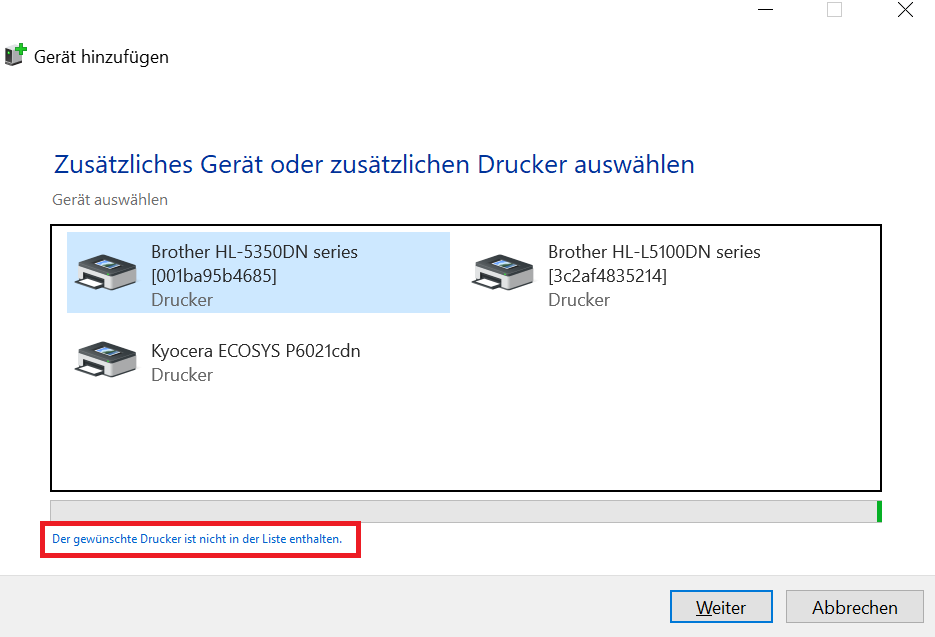 Wählen Sie im darauffolgenden Dialog "Der gewünschte Drucker ist nicht in der Liste enthalten"