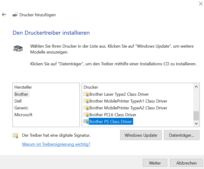 Wählen Sie den zu Ihrem Drucker passenden Treiber aus uns  schließen Sie die Installation ab