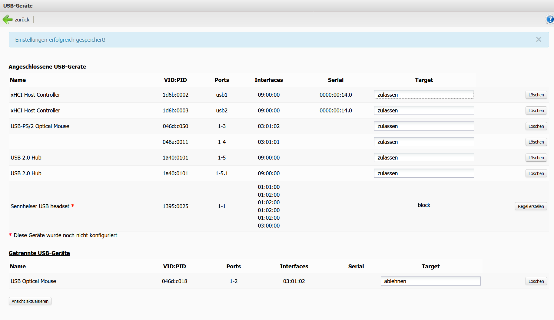 Bereits definierte regeln können über den "Löschen"-Button entfernt werden. Das Gerät verhält sich anschließend wieder wie ein unbekanntes neu angeschlossenes Gerät.