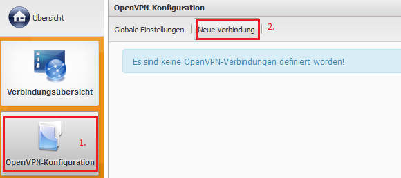 Im darauffolgenden Fenster klicken Sie auf OpenVPN-Konfiguration und dann auf Neue Verbindung, um eine OpenVPN Verbindung zu erstellen.