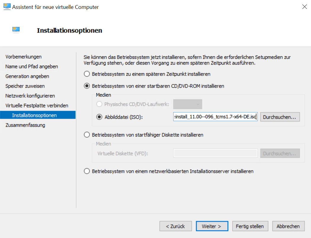• Im Schritt Installationsoptionen können Sie bereits die heruntergeladene ISO als Startmedium auswählen.