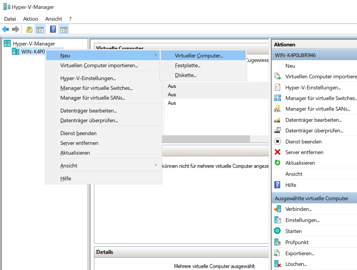 Öffnen Sie den Hyper-V-Manager und erstellen Sie eine neue Virtuelle Maschine, in dem Sie bspw. auf den Hostnamen rechtsklicken und zu Neu…->Virtueller Computer navigieren: