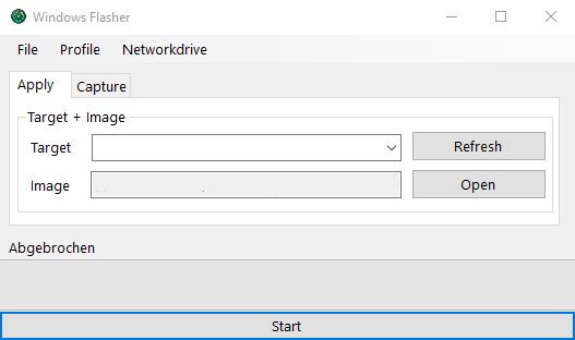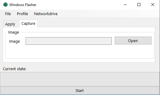 Nach dem Start des Windows Flashers können Sie den Reiter capture auswählen, um ein Windows Image aufzunehmen. Diese Images können Sie z.B. dazu verwenden um sie auf andere Geräte aufzuspielen. Bitte stellen Sie sicher, dass Sie vorher ein Sysprep ausgeführt haben (https://msdn.microsoft.com/de-de/library/windows/hardware/dn938334(v=vs.85).aspx).